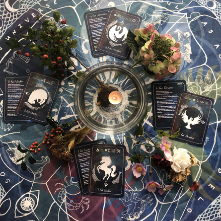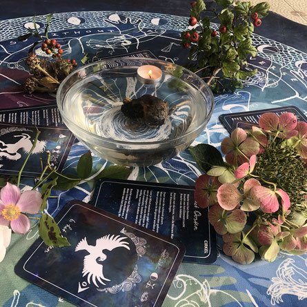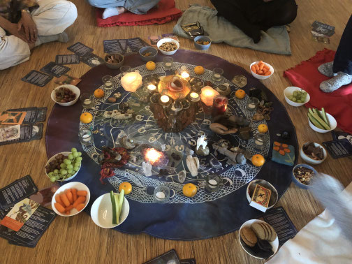 - Altaar in het midden van de cirkel met vier items op de windrichtingen (bijvoorbeeld afbeeldingen van de MoonSisters Sacred Circle kaarten)